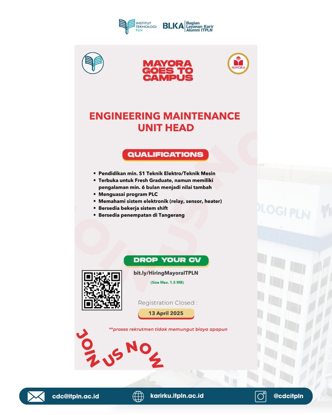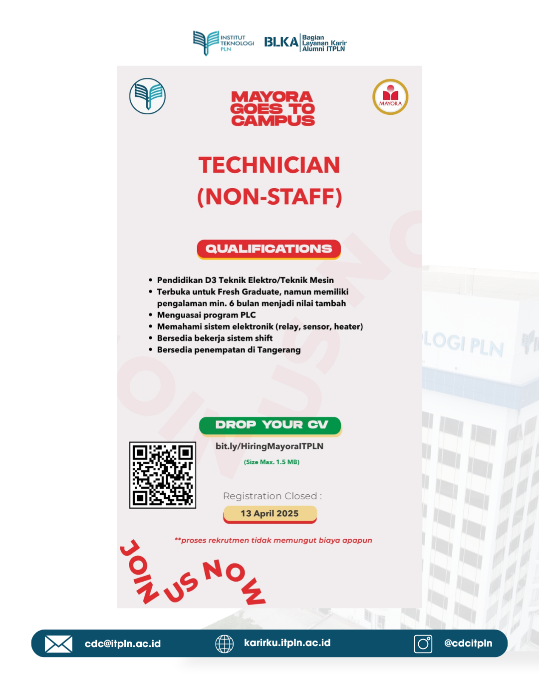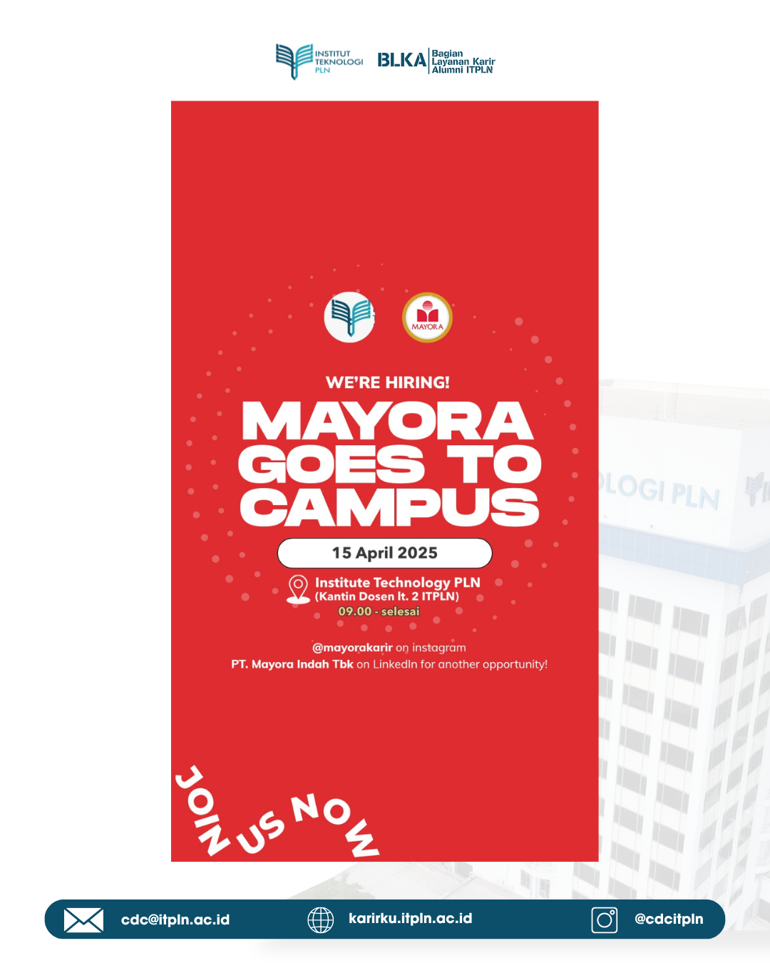 Mayora Group hadir langsung ke ITPLN dalam acara Campus Hiring yang akan diadakan pada: