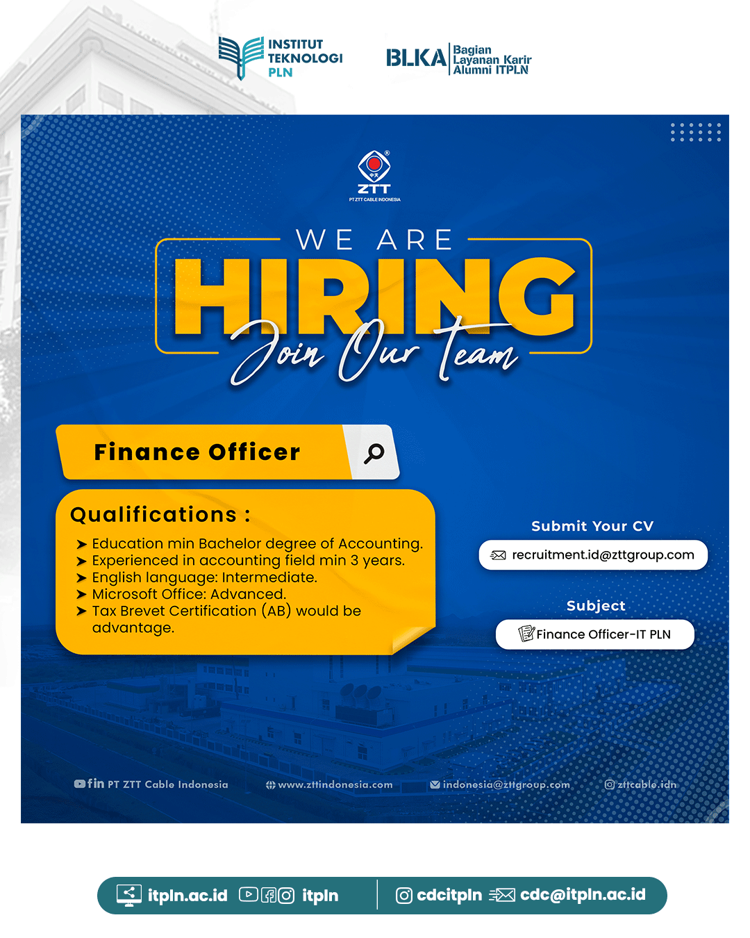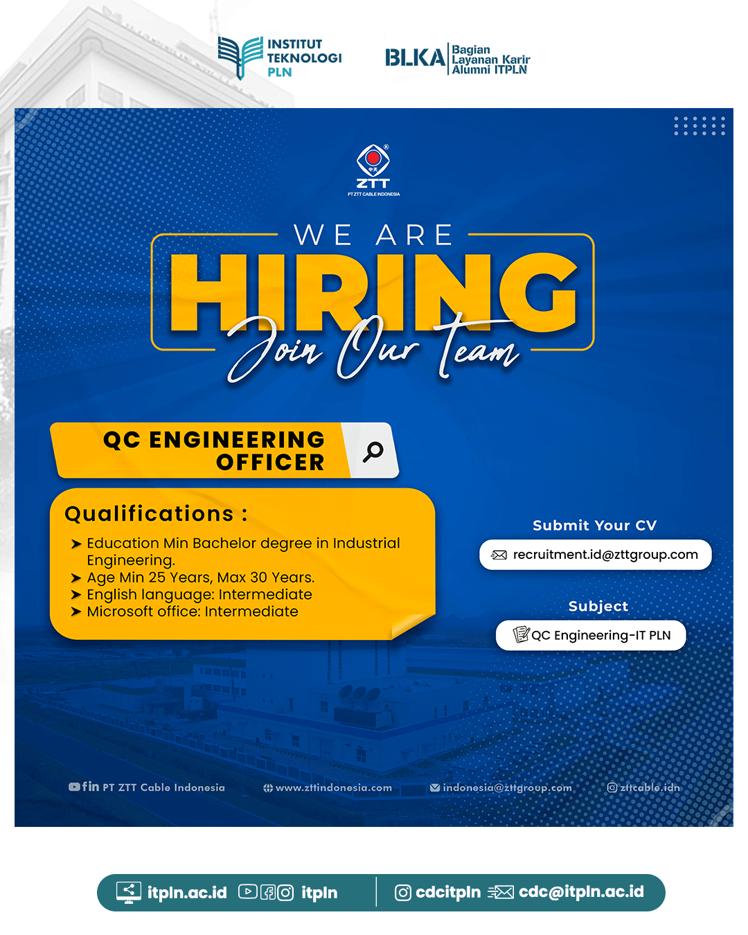 [ ZTT TIDAK PERNAH memungut biaya apapun dan untuk keperluan apapun dalam seluruh rangkaian proses rekrutmen. Informasi rekrutmen hanya diumumkan melalui situs www.zttindonesia.com dan akun resmi PT ZTT Cable Indonesia. Email resmi rekrutmen Perusahaan: [email protected] ]
