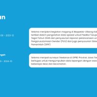 - Selama menjalani magang saya terlibat dalam proyek-proyek yang memberikan wawasan mendalam tentang dinamika pembangunan dan pengelolaan di wilayah tersebut. - Berpartisipasi dalam pengembangan Prediksi Tutupan Lahan Kabupaten Tegal Tahun 2045. Analisis data tutupan lahan tahun 1998, 2007, 2015, dan 2023 menyoroti perubahan signifikan dalam luas jenis tutupan lahan. Pada proses tersebut, saya terlibat dalam pengumpulan data, pemrosesan data menggunakan model simulasi, dan evaluasi hasil prediksi. - Melakukan analisis Pengarusutamaan Gender PUG di beberapa Organisasi Perangkat Daerah OPD. - Terlibat dalam analisis penyusunan Sistem Pengendalian Intern Pemerintah SPIP di OPD Dinas Perhubungan dan DP3AP2KB.